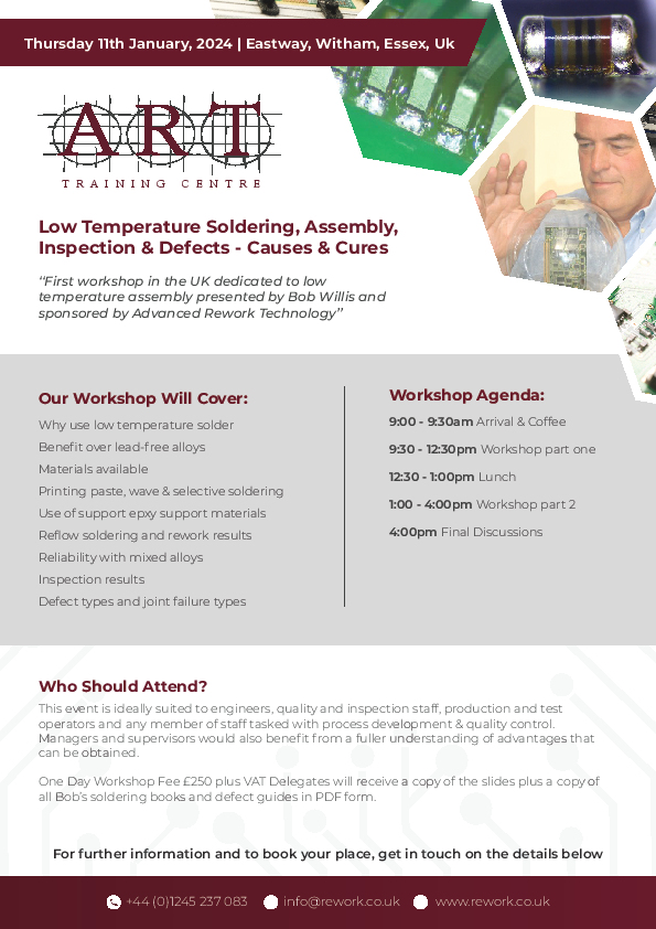 My new “Low Temperature Soldering Workshop” 2024 will be help on 11th January at Advanced Rework Technology, ART Witham, Essex. Contact ART for Further Information and register your place
